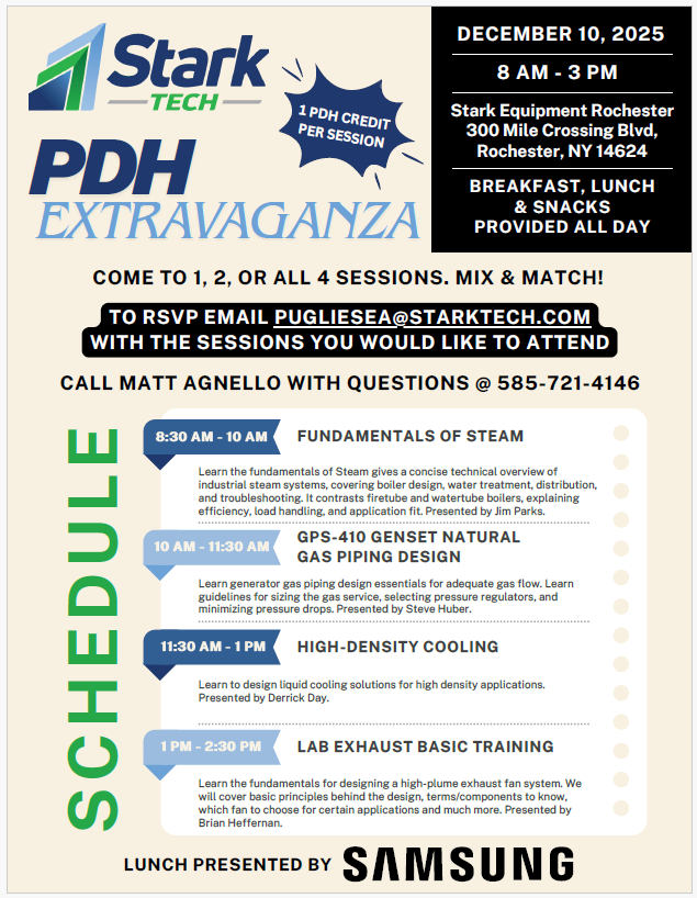 Stark Tech is hosting a free professional development event on December 10, 2025, from 8 AM to 3 PM at Stark Equipment Rochester (300 Mile Crossing Blvd, Rochester, NY). Breakfast, lunch, and snacks will be provided throughout the day. Attendees may join one or several of the PDH-accredited sessions.